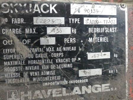 Nacelle cisaille élévatrice Marque : Skyjack Modèle : SJ009-17-13 Charge maximale : 455 kg Dimensions totales : 170 cm x 250 cm x 265 cm Etat : testé Remarque : enlèvement et chargement à charge de l'acquéreur