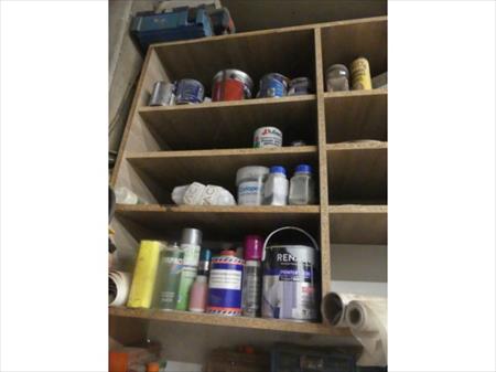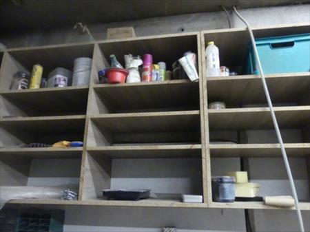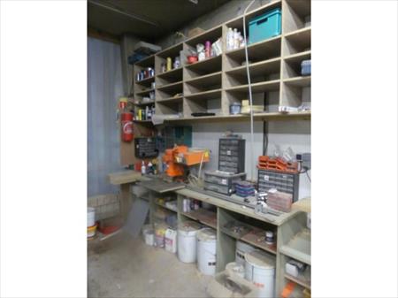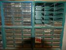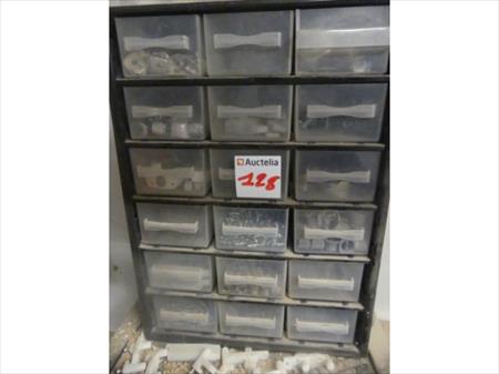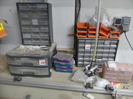 Contenus d'étagère : produits divers, visserie, pièces quincaillerie, Lot tel que sur photo Ne sont pas inclus dans le lot : perceuse sur colonne et perceuse de charnières