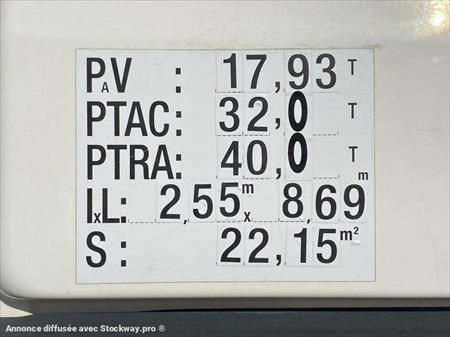 Camion Marque : Man type: TGA 35 400 Puissance :400 Année : 2007 - 27/08/2007 Km : 285 000 kms Boite de vitesse : manuelle Nombre Essieux :8X4 Grue Marque : PALFINGER Type de grue : PK18 Année : 2007 Radio commande : oui Nombre de stabilisateurs : 2 Position grue : arrière cabine Longueur Max : 10,4m Treuil : Cabine Pare soleil : oui Climatisation : oui Contrôle anti patinage : oui Blocage de différentiel : oui Radio cd : oui Chassis BI BENNE - GRUE Ptac : 32t PTAC : 32t P.V. : 17T93 PTRA: 40T Superstructure Entretien: Révision de la grue Révision du camion (vidange moteur boite pont) + boite et embrayage neuf Passage aux mines Controle de grue
