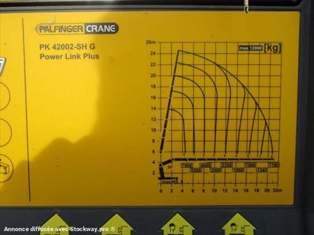 Marque MAN > Type TGX 35.540 8x4 Tridem Euro 5 > Année 2013 > Kilométrage 149.000 km > PTAC 32.000 kg > Classe d'émission Euro 5 > Boîte de vitesses Boîte manuelle > Carburant Diesel > Capacité de charge 12300 kg > Couleur Bleu > Poids (vide) 19.700 kg > Date du modèle à partir du 2013 > État général Très bon > Commande 8x4 plateau 6m10 > GRUE Palfinger PK 42002-SH G > Type de cabine PROFONDE > Boîte à outils Cabine de couchage Chauffage Climatisation Fenêtres électriques Feux de brouillard Frigo Limiteur de vitesse Pare-soleil Prise de force Radio / lecteur CD Retardateur Régulateur de vitesse Réservoir de carburant en aluminium Rétroviseurs extérieurs à réglage électrique Suspension pneumatique Verrouillage centralisé Éclairage au xénon
