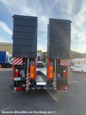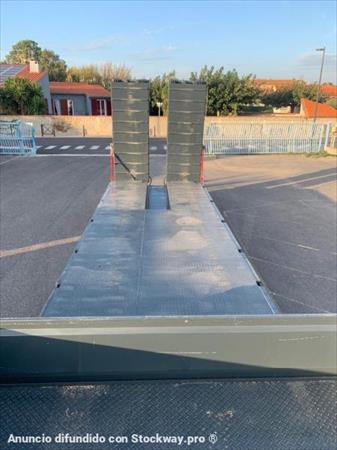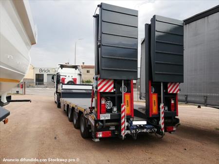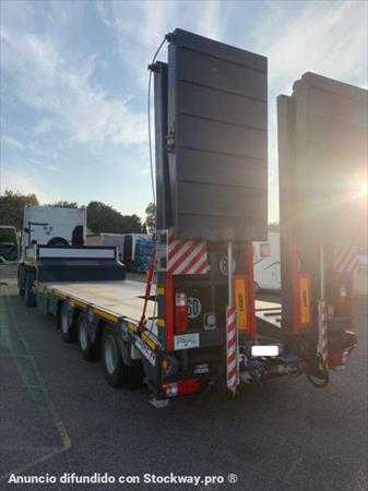 * 3 ejes lider 14 toneladas cada uno * 1 eje elevable con control manual y abs marca KNORR-BRESE DE * 1 eje autoajustable que se dispara a 30 km y bloqueo automático de marcha atrás * 13 neumáticos PIRELLELI 240/70 / 17.5 * tratamiento de pintura 2 capas primarias JOTUN EPOXY-PHENOLIC / VINIL ESTER protección * bajó 0.87 con cuello de cisne 3.51 * soporte + neumático de repuesto incluido * soportes mecánicos delanteros * zapatas de estacionamiento traseras manuales * Rampa de 3 m * Rampas AR hidráulicas dobles de 1000 cm de ancho y 4,52 cm plegables en acero * ensanchadores de rampa * suspensión neumática * iluminación y señalización de acuerdo con el código de carretera COC europe * predisposición para convoy excepcional (iluminación / paneles / conexión eléctrica ...) para transporte en convoy 1a categoría (largo y ancho) 4 girphares manuales + 8 leds en placas de convoy * 4 luces traseras de carreteras traseras integran 2 en las bandejas y 2 en las rampas * 2 luces led de trabajo traseras de última generación