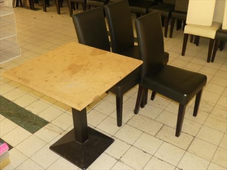 Tables en bois avec piètement métalliques, chaises en simili cuir Tables Quantité : 6 pièces Dimensions d'une table : 70 cm x 70 cm x 76 cm Etat : bon Chaises Quantité : 12 Dimensions d'une chaise : 40 cm x 48 cm x 93 cm Etat : usagé Remarque : enlèvement et chargement à charge de l'acquéreur, certaines chaises sont abimées au niveau du coin de l'assise et des pieds en bois
