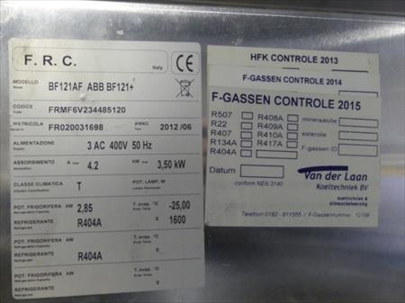Congélateur choc Marque : FRC Modèle : BF121AF Année : 2012 Tension : 400 V triphasé Puissance : 3,5 kW Gaz réfrigérant : R404a Quantité de gaz : 1,6 kg Température négative maximum : -25 ° Dimensions totale : 80 cm x 80 cm x 180 cm Etat : non testé Remarque : enlèvement à charge de l'acquéreur, chariot élévateur avec capacité de charge de 750 kg disponible