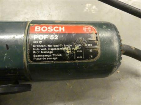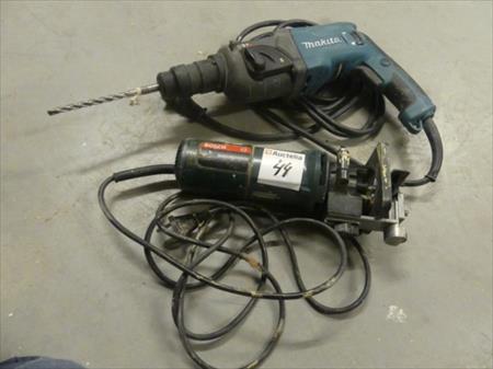 Perçeuse à percussion Marque : MAKITA Modèle : HR2460 Tension : 220 V monophasé Puissance : 780 W Etat : testé Mandrin et mèches SDS Affleureuse Marque : BOSCH Modèle : POF 52 Tension : 220 V monophasé Puissance : 500 W Etat : testé