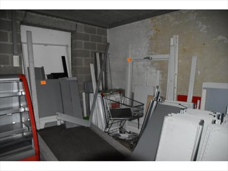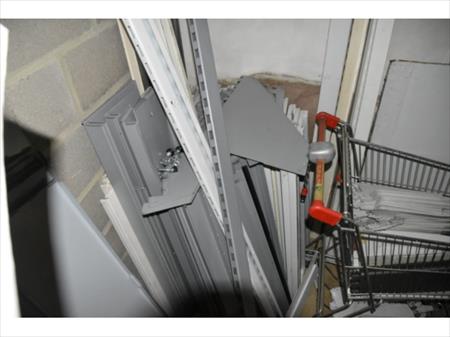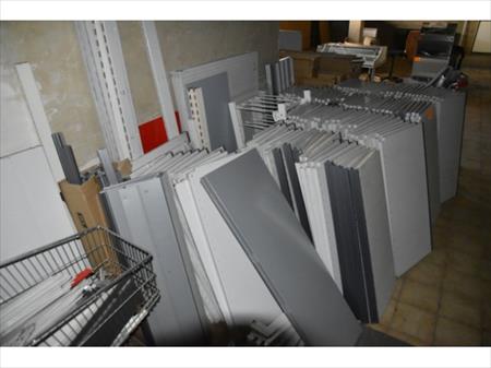 Grand lot de pièces détachées pour des étagères-rayonnages (pieds, tablettes, crochets, attaches, )