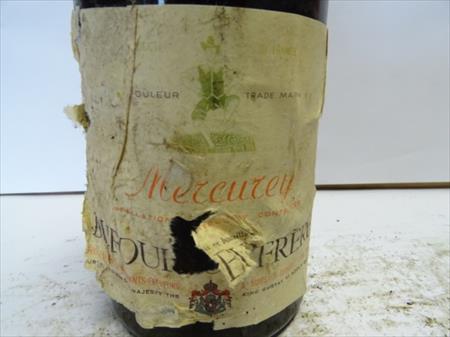 Bouteille de vin rouge Marque : Mercurey (Fouleur Frère) Année : 1981 Quantité : 11 pièces Aucune garantie de l'état des bouteilles, pas de reprise , pas d'échange