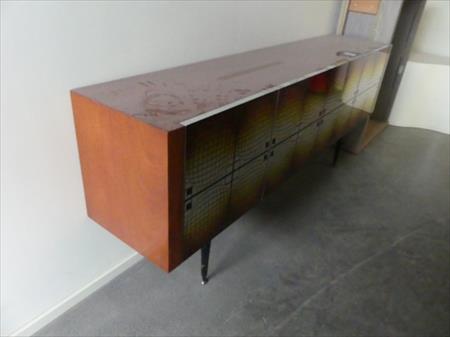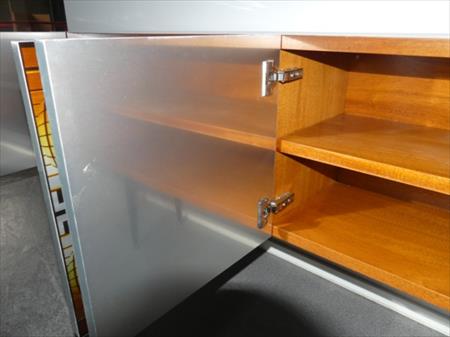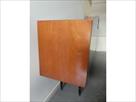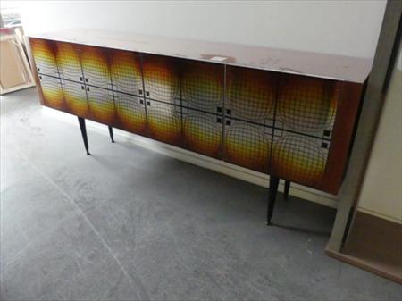 Petit meuble bas sur pieds à portes design Composition : 4 portes 1 tablette intérieure 4 pieds Dimensions totales : 171,5 cm x 35 cm x 70 cm Etat : neuf