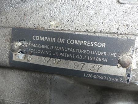 Compresseur Marque : Comp Air Numéro de série : 1326 53/32 97 37 Moteur thermique Deutz Modèle : F3L 1011F Puissance : 33 kW Dimensions d'encombrement : 140 cm x325 cm x 130 cm Etat : non testé et tel que sur photos Pas de documents