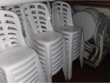 4 CHAISES DE TERRASSE EN PLASTIQUE (EMPILABLES) + 1 TABLE RONDE (PLIANTE