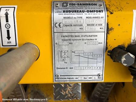 REF/DOSSIER AM119 CHARIOT FRONTAL TOUT TERRAIN 4X4 5T. MARQUE AUDUREAU OMFORT. TYPE STARK 90.50 4RM. SERIE 05972706. ANNEE 05/1997 . MOTEUR PERKINS 70/80 CV ENVIRON . CABINE FERMEE . MOTEUR 4 CYLINDRE DIESEL 4 ROUES MOTRICES . 6400 HEURES EVOLUTIF . PUISSANCE 5000 KG . POIDS A VIDE 7800 KG. MAT DUPLEX HAUTEUR MAXI 3M60 TDL- TABLIER A DEPLACEMENT LATERAL 4500KG . CIRCUIT HYDRAULIQUE SUPPLEMENTAIRE. TRAVAUX EFFECTUES :Vidange complète moteur boite hydraulique ponts ,liquide de refroidissement. remplacement des radiateurs eau et huile ,batterie neuve contrôle vgp OK