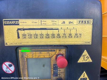 Camion Marque : Renault type: PREMUIM Puissance :280cv Année : 2007 Km : 189000 kms Boite de vitesse : MANUELLE Nombre Essieux :4X2 Grue Marque : FASSI Type de grue : F235 AD 25 Année : 2007 Radio commande : OUI Nombre de stabilisateurs : 4 Nombre d'extension : 5HYDROLIQUE +3 MANUELLE Position grue : arrière cabine Longueur Max : 21 METRE 500KG Cabine Pare soleil : oui Climatisation : oui Contrôle anti patinage : oui Blocage de différentiel : oui Radio cd : oui Chassis PLATEAUX RIDELLE 6M90X245X0.80 Ptac : 18T PV : 12T500 CH 5T5 Entretien: Révision du camion (vidange moteur boite pont) Passage aux mines Controle de grue