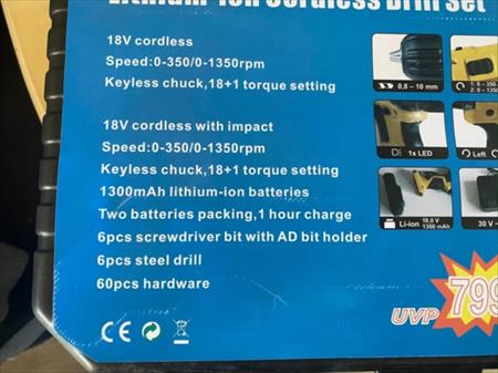 Contenu: un tournevis sans fil, un tournevis à percussion sans fil, un chargeur, 6 perceuses, percussion 7 bits et 2 batteries
