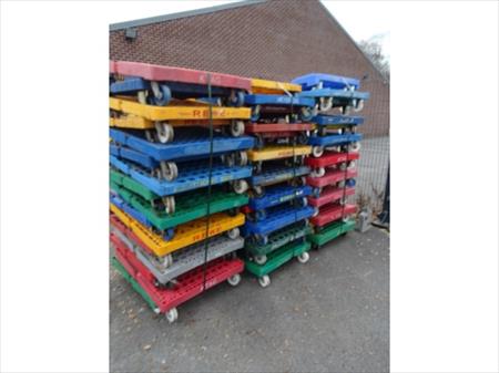 Chariots Matériel : plastique Fond : synthétique Roues devant : 2 roues pivotantes Roues derrière : 2 roues fixes Couleur : couleurs divers Longueur (mm) : 820 Largeur (mm) : 720 Hauteur (mm) : 190 Quantité : 6 pcs Remarque : Les chariots seront distribués au fur et à mesure avec leurs éventuels défauts d'utilisation (impossibilité de choisir couleurs, défauts, ...)
