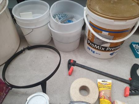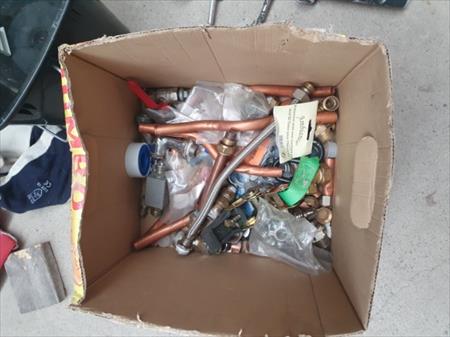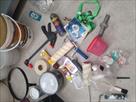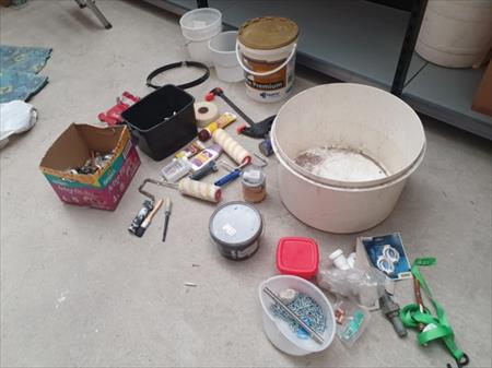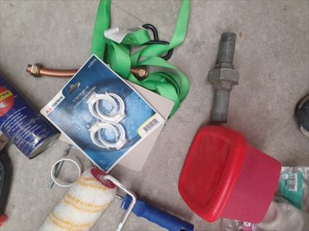 Grand lot divers quincaillerie / outillage dont Mix pour Gyproc, rouleaux de peintures, raccord sanitaire en cuivre, serre-joint, enduit, peinture, etc.