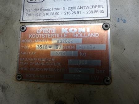 Pont de garage 2 colonnes Marque : Koni Modèle : KS2022 Année : 1988 Tension : 380 V triphasé Capacité de levage : 2200 kg Dimensions totals : 102 cm x 50 cm x 395 cm Etat : toujours en fonction Remarque : démontage, enlevement et chargement à charge de l'acquereur