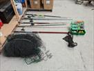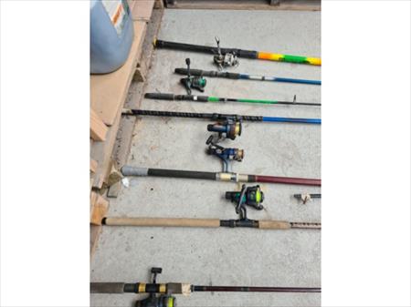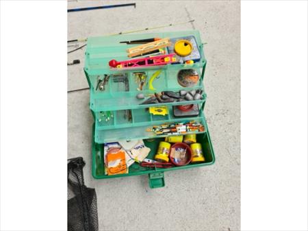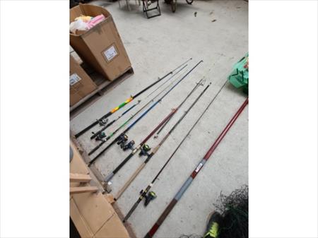 Grand lot ustensiles de pêche, hameçons, filets, cannes à pêches, moulinets