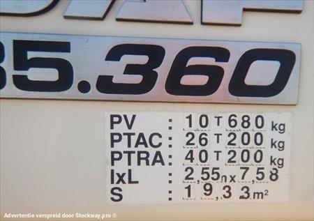 DAF CF85.360 polybenne 6x2 1ère M.E.C : 05/2007 Kilométrage : 468 361km Boite manuelle PV : 10T680 PTAC : 26T200 PTRA : 40T200 lxL : 2.55m x 7.58m Suspension pneumatique 3 ème essieu relevable Pneus : 315/80R22.5 EQUIPEMENTS : Bras Dalby SHM2 Potence inclinable 4 crochets de verrouillage Barre anti-encastrement fixe Remorquant 40T crochet MG Ralentisseur hydraulique Coffre Casquette Climatisation Ordinateur de bord Dos de cabine vitré