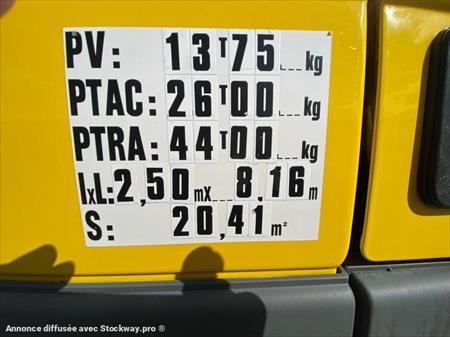 marque MERCEDES-BENZ modèle ACTROS 2641 145500KMS - 06/11/2012 Type de cabine JOURS couleur JAUNE Climatisation Radio CD / DVD Régulateur de vitesse Tachygraphe numérique bocage différentiel ptac 26000 kg Poids a vide 13750 kg Capacité de chargement 12250 kg ptra 44000kg Nombre d'essieux 3 Type d'entraînement 6X4 Puissance du moteur 410 ch Norme d'émission EURO 5 capacité 11967 CM3 transmission EPS + EMBRAYAGE retarder bi benne forez longueur 5,1 M hauteur 0,8 M largeur 2,3 Mmarque MERCEDES-BENZ modèle ACTROS 2641 Type de cabine JOURS couleur JAUNE Climatisation Radio CD / DVD Régulateur de vitesse Tachygraphe numérique bocage différentiel ptac 26000 kg Poids a vide 13750 kg Capacité de chargement 12250 kg ptra 44000kg Nombre d'essieux 3 Type d'entraînement 6X4 Puissance du moteur 410 ch Norme d'émission EURO 5 capacité 11967 CM3 transmission EPS + EMBRAYAGE bi benne forez longueur 5,1 M hauteur 0,8 M largeur 2,3 M