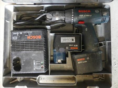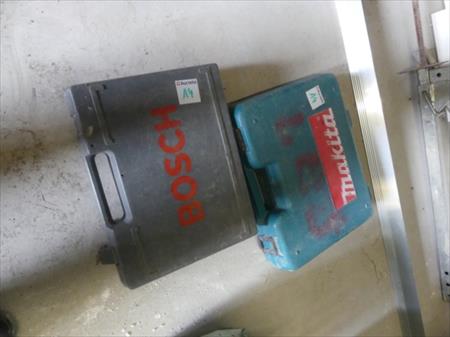 Visseuses Marque : Bosch, Makita Modèle : GSR 12VES-2, 6389D Bosch sur accu et makita 230 V monophasé Etat : non testé Foreuse Marque : AEG Tension : 230 V monophasé Etat : non testé Remarque : fourni avec coffret