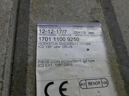 Bordures d'angle Solde de chantier Epaisseur : 15 cm Hauteur : 30 cm Longueur : 92 cm Angle : ext 135° Quantité : 28 Etat : sur palette