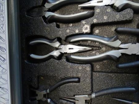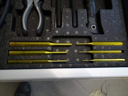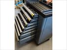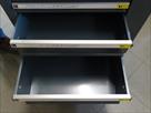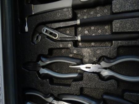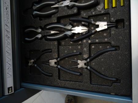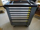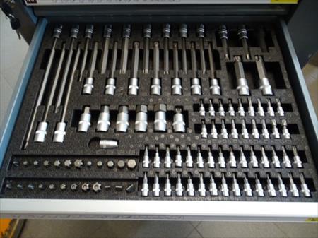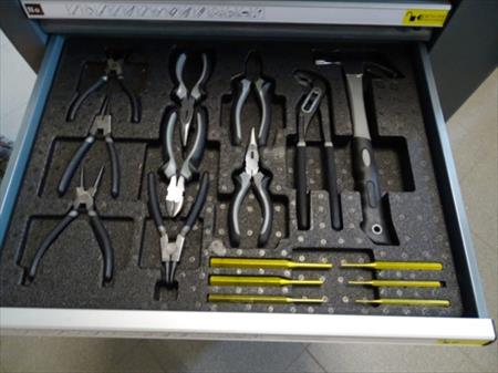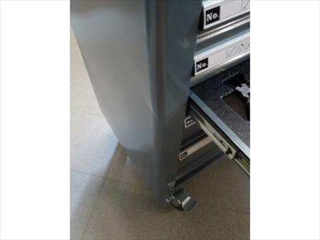 Servante à outils d'atelier professionnelle Marque : Professional-Line 5 tiroirs dont 4 avec outils (231 pièces) 2 roues pivotantes, une avec frein Desserte fonctionnelle Remarque : coin gauche bosselé, serrure façade hors service, serrure côté fonctionne fourni avec 2 clés Quelques bosses sur un côté. Envoi : Tarif D