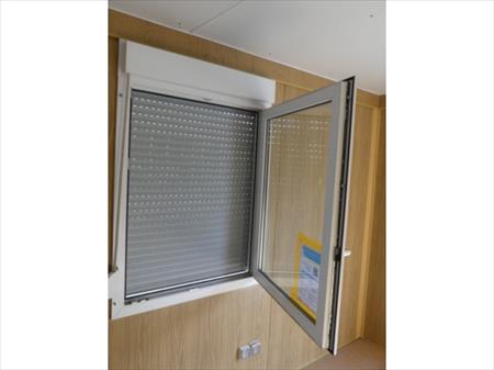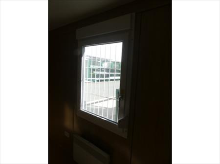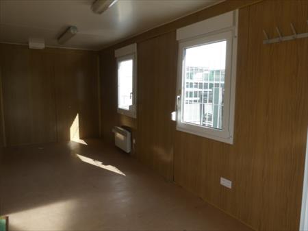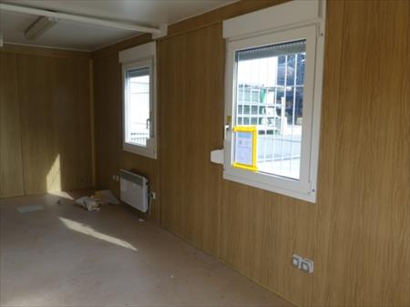Composition interne : 2 fenêtres à châssis oscillo battant avec volet sur une face, 1 porte, 1 coffret électrique, 1 chauffage radiant électrique, 4 prises de courant monophasé, éclairage
