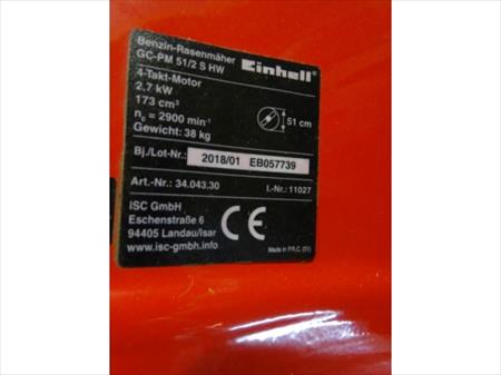 Tondeuse Marque : Einhell Modèle : GC-PM 51/2 S HW 2,7 kW - 173 cc - 2900 t/min Largeur de coupe : 51 cm Poids de la machine : 38 kg Etat : Non testé Envoi : Tarif D