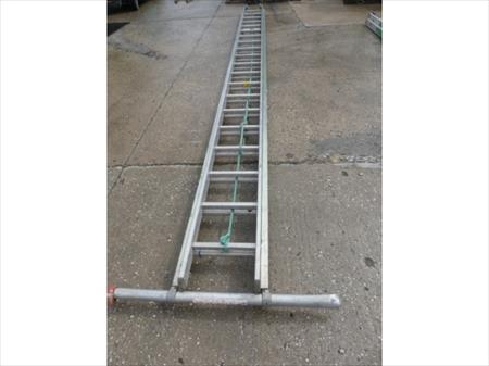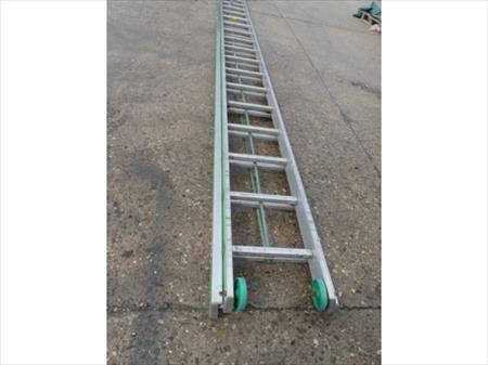Echelle aluminium 2 éléments Nombre d'échelons : 2 x 20 Longueur d'un élément : 577 cm Dimensions de transport : 577 cm x 110 cm x 18 cm Munie d'un système de déploiement par corde Etat : usagé Remarque : possible coups sur les échelons