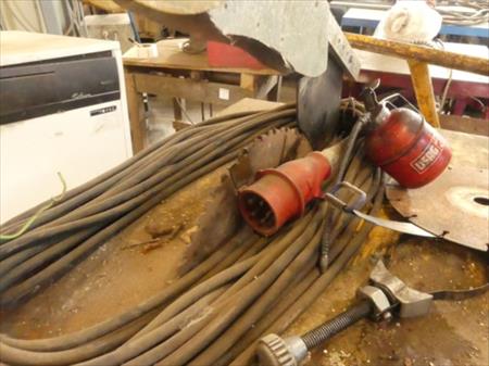 Scie circulaire sur roulette Tension : 380 V triphasé Diamètre de lame : 36 cm Dimensions totales : 140 cm x 70 cm x 120 cm Etat : non testé