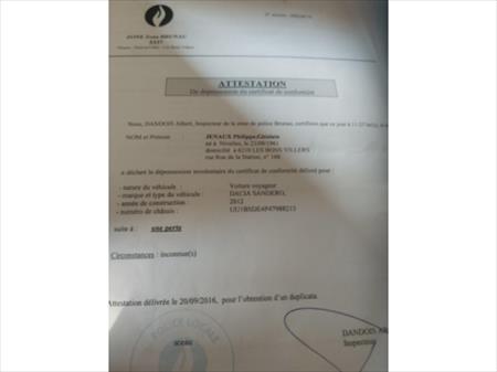 Voiture Marque : Dacia Modèle : Sandero Numéro de châssis : UU1BSDE4P47988213 Date de 1ère mise en circulation : 12/2012 Kilométrage : 11303 km Moteur : Carburant : Diesel Equipements : Air conditionné, radio, Documents fournis : - Attestation de perte (délivrée le 20/09/2016). Pas de certificat d'immatriculation, pas de contrôle technique - Certificat de conformité Etat : testé