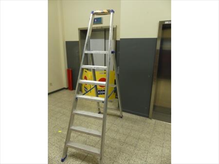Escabelle aluminium Nombre de marches : 7 Hauteur dernière marche : 153 cm Longueur totale fermée : 230 cm Etat : bon