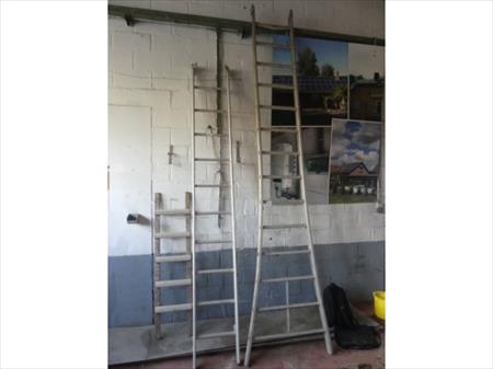 Eléments d'échelles Quantité : 2 Dimensions : 1 x 41 cm x 8 cm x 305 cm 1 x 48 cm x 7 cm x 335 cm Etat : usagé Remarque : 1 éléments est plié a sa base supérieure