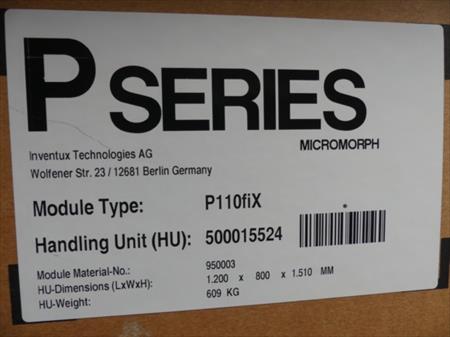 Panneaux photovoltaïques Marque : Inventux Modèle : PSERIES P110FIX Quantité de panneaux : 22 pièces Poids d'un carton : 609 kg Dimensions du contenant : 120 cm x 80 cm x 151 cm Etat : neuf Enlèvement en début de journée