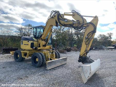 Pelle à pneus KOMATSU type PW98MR-6 Année : 2011 Heures : 7200 Poids : 9.5 t Lame + stabilisateurs Déport pied de flèche - Flèche à volée variable + Déport Ligne hydraulique Pneus jumelés changés à 5000 h Coupleur hydraulique + godets Les pneus ont été changés il y a 1000 h. Une ligne hydraulique a été ajoutée La révision a été faite récemment