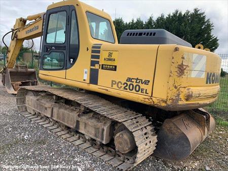 Pelle sur chenilles KOMATSU PC200EL-6K Année : 2001 Heures : 13500 Poids : 19.3 tonnes Flèche monobloc Tuiles acier (600 mm) Ligne hydraulique Coupleur + 3 godets Couronne neuve