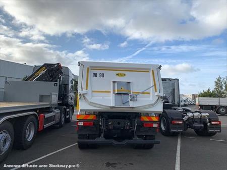 DISPONIBLE échappement vertical - optifleet check 4 ans - optifleet map 4 ans - pack confort drive - pare choc tole - porte bouteille réfrigéré - réchauffeur filtre gasoil thermique - refroidisseur bv renforce - benne ronde Meiller -"Halfpipe" 5m30 x 2m30 x 1m40 ( 15,11 m3 Fond 8mm Hardox 450 en1 seule tôle ridelle 6mm Hardox 450 face av. et porte arr. 5mm Hardox 450 porte arr. 2 vérins à double effets. Ridelle haut. 1m40 Crochets de bâche Barre anti encastrement hydraulique à double commande ( cabine et extérieur ) compatible finisher - Bâchage électrique Meiller avec télécommande - jupe AR automatique et arceaux de 300 mm