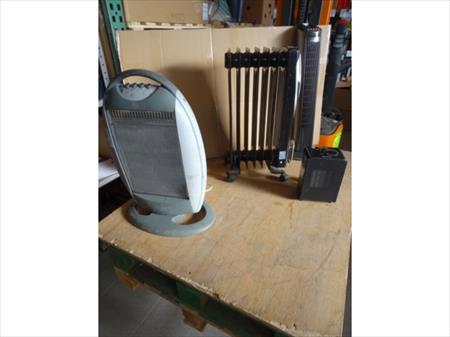 Radiateur radiant oscillant Marque : EINHELL Puissance : 1200w Radiateur radiant soufflant Marque : SOULKER Puissance : 1500w Radiateur bain d'huile Marque : OLYMPIA Remarque : pas de câble Radiateur soufflant colonne oscillant Marque : TAURUS Avec minuterie. Etat : aucun radiateur n'a été testé. Envoi : Tarif D