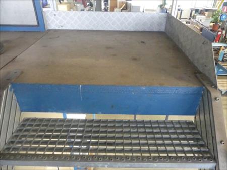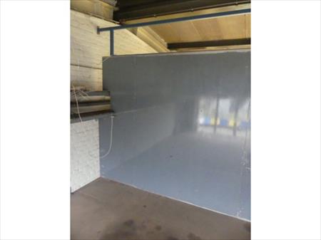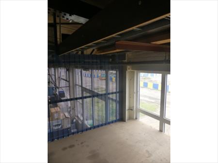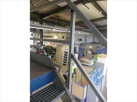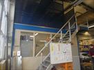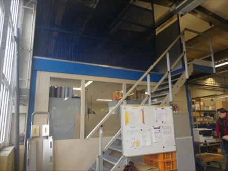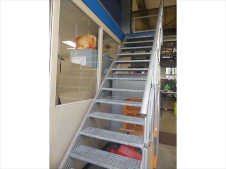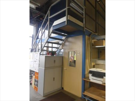 Parois de bureau avec grillage Hauteur maximale des grillages : 254 cm Dimensions totales : 433 cm x 500 cm x 275 cm Escalier Hauteur de palier : 275 cm Nombre de marches : 15 Démontage et enlèvement à charge de l'acquéreur, pas d'engin de levage disponible, certaines parties sont soudées