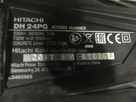 Foreuse Marque : Hitachi Modèle : DH 24 PG Année : 2017 Tension : 230 V monophasé Puissance : 730 W Etat : testé Avec cette foreuse : 4 mèches à béton