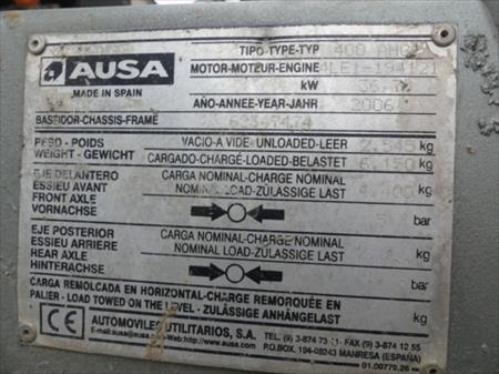 Mini dumper Marque : AUSA Modèle : 400 1HG Année : 2006 Puissance : 36,7 kW Poids vide : 2545 kg Capacité de charge : 2000 kg Heures : 2539 h Dimensions du bac : 205 cm x 170 cm x 90 cm Dimensions totales : 390 cm x 180 cm x 205 cm Etat : testé Remarques : présences de coups et griffes d'usures normales
