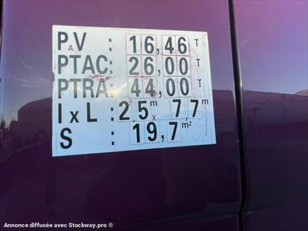 Marque : Mercedes type: Actros 2641 puissance :410cv Année : 2009 Km : 252 000km Boite de vitesse : auto Eps Nombre Essieux :6x4 Suspension : air Grue Marque:Fassi Model: f360xp Année : 2009 Radio commande:oui Nombre extensions: 4 Nombre extension jib: 4 Longueur maxi: 20m Crochet: oui Cabine Pare soleil : oui Climatisation : oui Contrôle anti patinage : oui Blocage de différentiel : oui Radio cd : oui Chassis Ptac : 26t PV: 16t46 PTRA: 44t Taille pneu avant : 385/65r22.5 Taille pneu arrière : 385/65r22.5 Structure Longueur 7,70 Empattement 3,90 1-2 Entretient: Révision du camion (vidange moteur boite pont) Passage au mine VGP grue 6mois