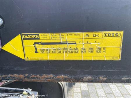 Marque : Mercedes type: Actros 2641 puissance :410cv Année : 2009 Km : 252 000km Boite de vitesse : auto Eps Nombre Essieux :6x4 Suspension : air Grue Marque:Fassi Model: f360xp Année : 2009 Radio commande:oui Nombre extensions: 4 Nombre extension jib: 4 Longueur maxi: 20m Crochet: oui Cabine Pare soleil : oui Climatisation : oui Contrôle anti patinage : oui Blocage de différentiel : oui Radio cd : oui Chassis Ptac : 26t PV: 16t46 PTRA: 44t Taille pneu avant : 385/65r22.5 Taille pneu arrière : 385/65r22.5 Structure Longueur 7,70 Empattement 3,90 1-2 Entretient: Révision du camion (vidange moteur boite pont) Passage au mine VGP grue 6mois