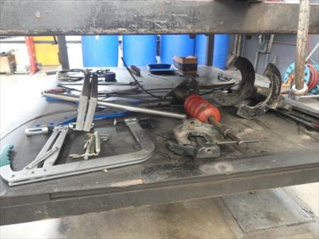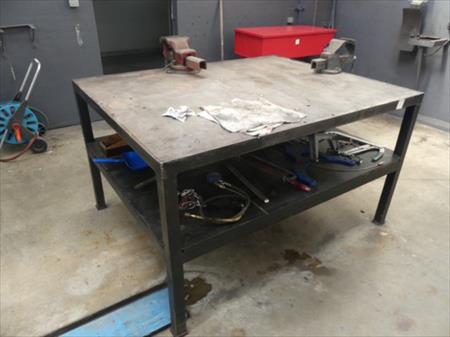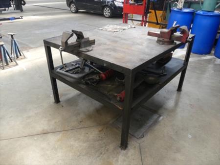 Etabli d'atelier en acier avec 2 étaux Poids estimé : 250 kg Dimensions établi : 121 cm x 151 cm x 87 cm Remarques : outillage et contenu inclus dans le lot, lot tel que sur photos