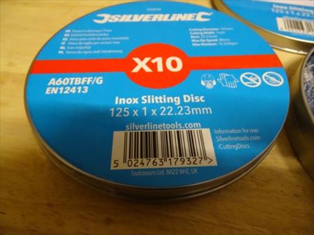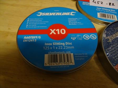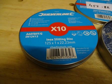 Disque à découper inox Marque : SILVERLINE Référence : A60TBFF/G Quantité : 2 boîtes de 10 pièces 125 x 1 x 22.23 mm Envoi : Tarif A