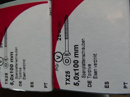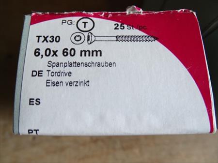 Vis tête TORX Détail : . 25 vis de 6 x 60 mm . 125 vis de 5 x 100 mm . 45 vis de 8 x 50 mm . 30 vis de 8 x 40 mm . 50 vis de 3,2 x 60 mm autoforantes Envoi : Tarif B