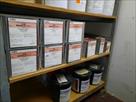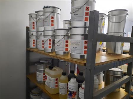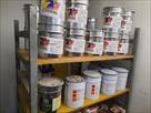 Le support contient des bidons scellés de durcisseurs, d'huile, de teinture et de vernis.