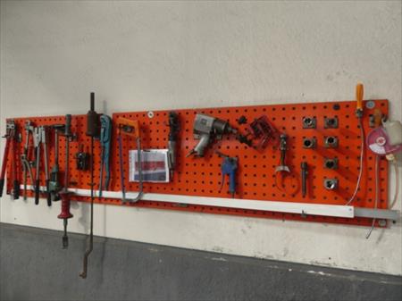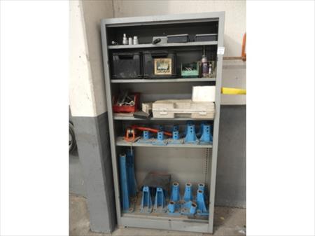 Armoires métalliques d'atelier et outillages Dimensions d'une : 95 cm x 40 cm x 195 cm Quantité : 2 pièces (1 armoire sans portes) Fourni avec un panneau mural et ses outils inclus Remarques : contenu des armoires inclus