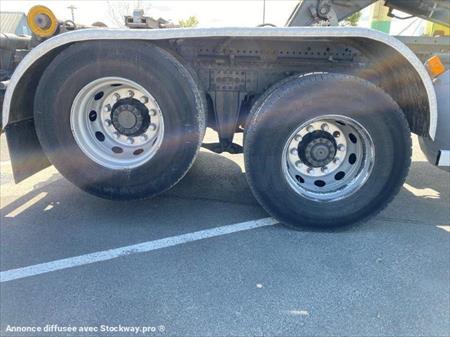 VOLVO FH 500 6x2 Polybenne 1 ère M.E.C : 05/11/2012 Kilométrage : 1 068 672 Motorisation : 12 777cm3 - 500ch Boîte de vitesse : automatique Norme : Euro 5 Ad blue Pneumatiques : AV : 385 / 65 R22.5 - AR : 315/ 80 R22.5 Suspension AR pneumatique 3 ème essieu relevable PV : 12.229 T PTAC : 26T PTRA : 44 T Remorquant crochet MG Equipement : Bras polybenne GUIMA Palfinger S21 Potence articulée 2 crochets de verrouillages AR Barre anti-encastrement escamotable hydraulique Passerelle devant bras Grand réservoir coffre de rangement Cabine haute et profonde 2 couchettes 2 places assises Ordinateur de bord Climatisation Régulateur de vitesse Autoradio CD / USB / AUX Toit ouvrant Rangement Aide au démarrage en côte