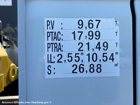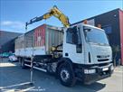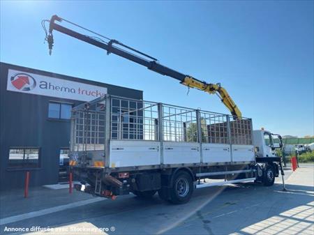 IVECO Eurocargo 18E250 EEV plateau grue HYVA 1 ère M.E.C : 19/04/2012 Kilométrage : 226 058 Boîte de vitesse : manuelle 6 rapports Motorisation : 6 cylindres, 5880cm3 : 250ch Norme : EURO 5 EEV PV : 9.67T PTAC : 17.99T PTRA : 21.49T L x l : 2.55m x 10.54m Empattement : 6.25m Pneumatiques : 12R22.5 AV et AR Suspension : mécanique EQUIPEMENTS : GRUE HYVA 911 3s 3 allonges hydrauliques Portée : 2120kg à 4.30m / 1440kg à 6.04m / 1100kg à 7.84m / 865kg à 9.70m Rotator Radiocommande 2 Stabilisateurs HAYON Rétractable DHOLLANDIA : 1500kg Plateau GALVA à ridelles alu + réhausses Plancher bois dur Porte arrière standard Dimensions utiles : 7.50m x 2.45m x 0.70m CABINE : courte 3 places assises Ordinateur de bord Climatisation Régulateur de vitesse Caméra de recul 2 x gyrophares