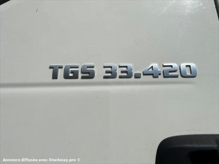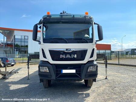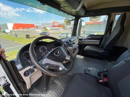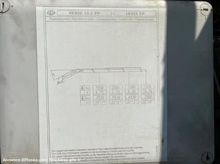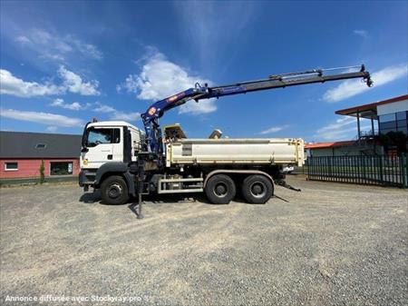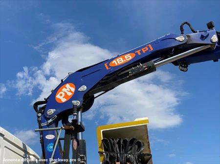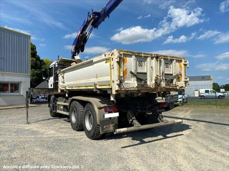 MAN TGS 33.420 6x4 Bi-benne et grue PM 18.5 TP 1 ère M.E.C : 22/01/2018 Kilométrage : 113000 Motorisation : 12419cm 3 - 420ch Boîte de vitesse : automatique Essieux : 6x4 Suspension : Mécanique Pneumatiques : 13R22.5 PV : 16 T 522 PTAC : 26 T PTRA : 44 T l x L : 2.52m x 8.54m EQUIPEMENTS : GRUE PM 18.5 TP 3 allonges hydrauliques Portée : 1520kg à 10.30m / 1900kg à 8.30m / 2500kg à 6.50m / 3550kg à 4.75m Rotator Benne preneuse Radiocommande 2 patins de stabilisation Passerelle Bi-Benne COX Ridelles gauche hydraulique Porte arrière universelle 2 trappes à enrobés Bâche Cramaro manuelle BAE hydraulique Remorquant 44T crochet pommier CABINE : courte 2 places 2 gyrophares Casquette régulateur de vitesse Climatisation Vitres électriques Toit ouvrant